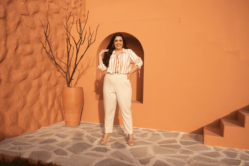Medidas da modelo - Busto: 111cm / Cintura: 96cm / Quadril: 121cm / Altura: 167cm.